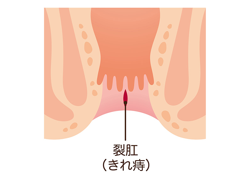 肛門の粘膜に裂け目(亀裂)ができる疾患です。硬い便の排出時や下痢による刺激で肛門が傷つくことが主な原因です。排便時にガラスで切られるような鋭い痛みを感じ、トイレットペーパーに鮮血が付着することが特徴です。痛みを恐れて排便を我慢すると便秘を引き起こし、さらに症状が悪化するという悪循環に陥りやすくなります。治療には局所麻酔剤入りの軟膏や坐薬を使用し、食物繊維を多く含む食事や十分な水分摂取により便を柔らかくする工夫も重要です。慢性化した場合には肛門括約筋の一部を切開する手術が必要になることもあります。