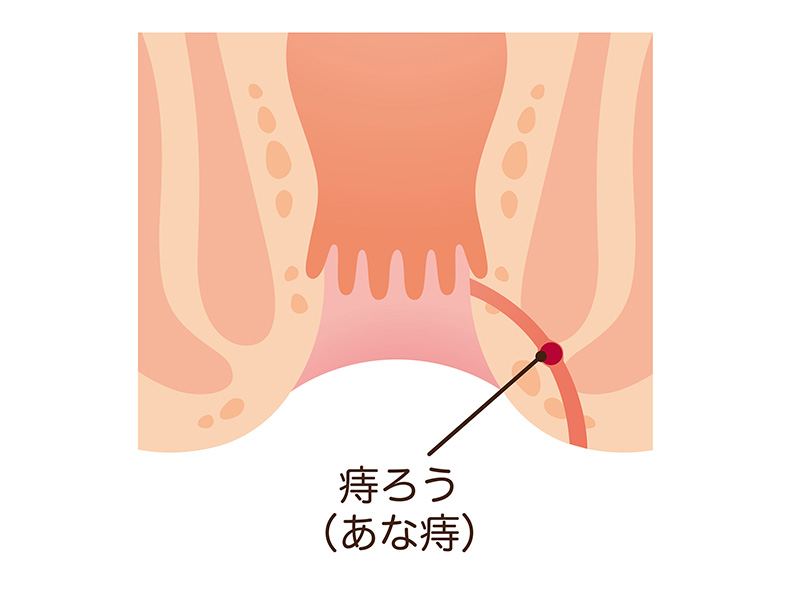 肛門の内側(肛門腺)に細菌感染が生じ、膿がたまって肛門周囲の皮膚に穴(瘻孔)を作る疾患です。肛門周囲の痛みや腫れ、膿の排出、発熱などの症状が現れます。一度治療して症状が改善しても再発することが多く、根本的な治療には瘻管(異常な管)を切除する手術が必要となります。クローン病など他の疾患が原因となっている場合もあるため、正確な診断が重要です。当クリニックでは詳細な検査を行い、患者さんの状態に最適な治療法をご提案します。手術が必要な場合は提携している専門医療機関をご紹介いたします。