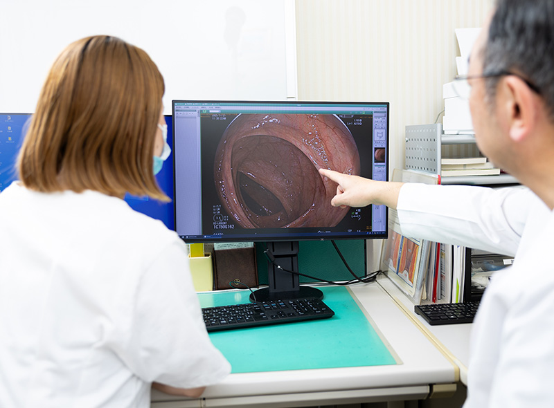 腸は、小腸と大腸に分けられ、栄養素の吸収や便の形成を行う消化管です。腸の疾患には、腹痛や便通異常を特徴とする過敏性腸症候群、大腸の粘膜に炎症や潰瘍ができる潰瘍性大腸炎、消化管全体に炎症が起こるクローン病、大腸ポリープや大腸がんなどがあります。腹痛、下痢、便秘、血便、粘液便、腹部膨満感などの症状がある場合は、早めの受診をお勧めします。当クリニックでは大腸内視鏡検査を行い、これらの疾患の早期発見・早期治療に努めています。特に大腸がんは早期発見により完治が期待できるため、40歳を過ぎたら定期的な大腸検査をお勧めしています。
