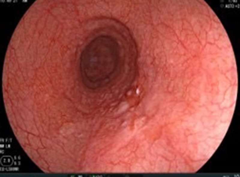 食道は、口から飲み込んだ食べ物を胃へ送るための細長い通路です。この部位には、胃酸の逆流によって粘膜が炎症を起こす逆流性食道炎や、細胞が異常に増えることで生じる食道がん、さらに食道静脈瘤など、さまざまな疾患が発生する可能性があります。胸やけやのどのつかえ感、飲み込みづらさ、持続する違和感などの症状が現れた場合は、早めの受診が大切です。内視鏡検査による観察と、必要に応じた組織採取(生検)で病変の有無を詳しく調べ、正確な診断につなげています。特に逆流性食道炎は生活習慣との関連が深いため、治療とあわせて食事・姿勢などの生活指導にも力を入れています。右は浅い陥凹を呈する食道粘膜内癌です。専門施設で内視鏡的切除を行い治癒しました。